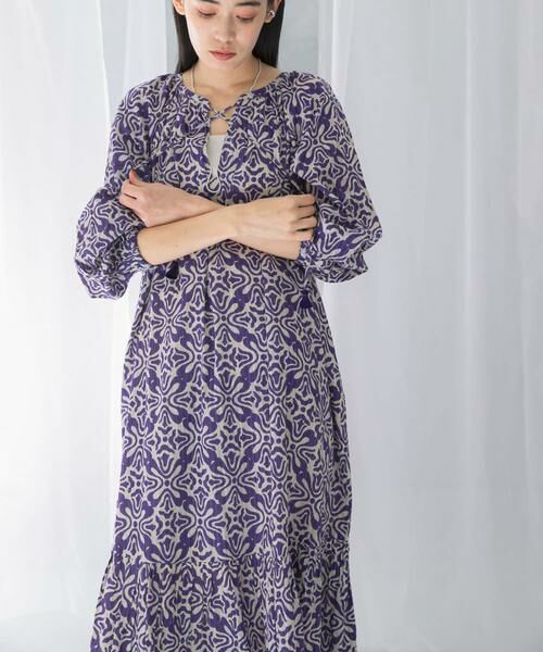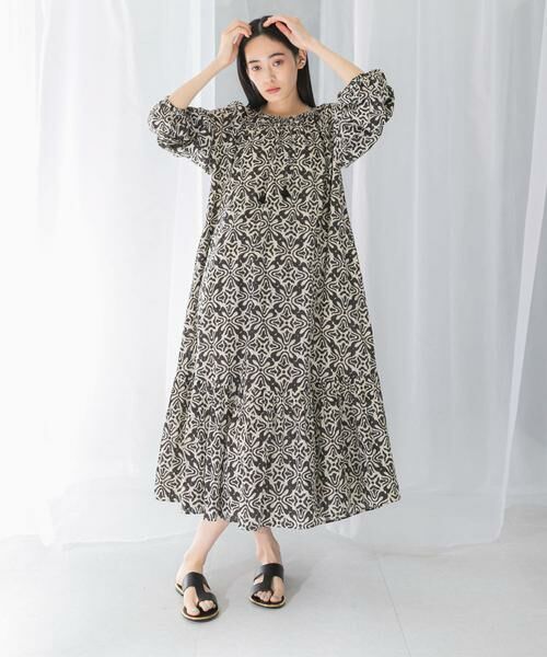 水滴をポトンと落とした時に広がる波紋のようなモチーフを全面にプリントしたロングドレス。裾までストンと落ちるIラインシルエットでリラクシーな着心地。裏地がついているので透けを気にせず着用できます。