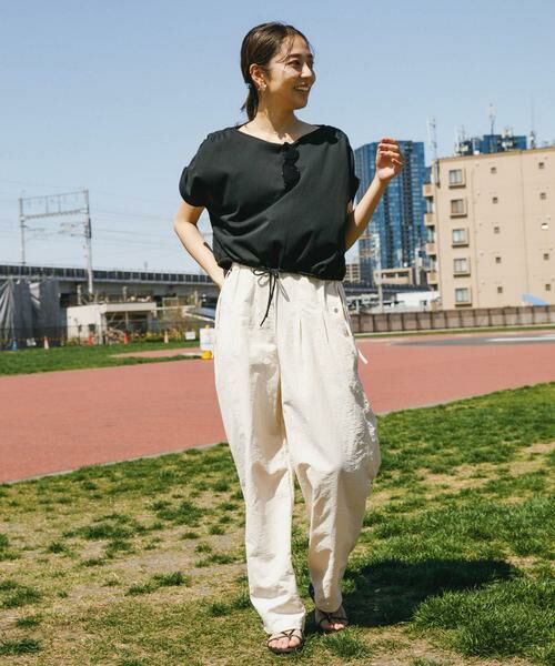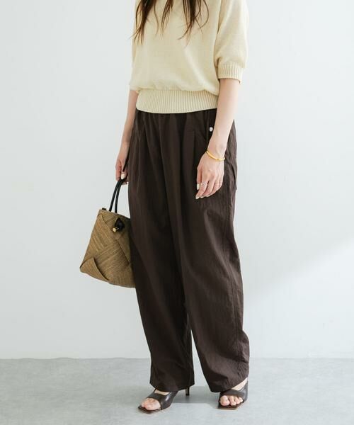 撥水加工が施されたイージーパンツは、梅雨時期からアウトドアシーンまでこれからの季節の強い味方に。ウエスト両サイドの紐を甘め派はリボンに、辛口派は垂らしてとお好みのイメージに調整可能です。ワイドシルエット×ウエストゴムはリラクシーな着心地を実現。コーディネートのポイントになるPINK、BROWNと定番IVORYの三色でご用意しました。IVORYとBROWNは同素材の撥水ナイロンバックオープンプルオーバー(品番:RAA5-23Y507)とのセットアップコーデもお勧めです。