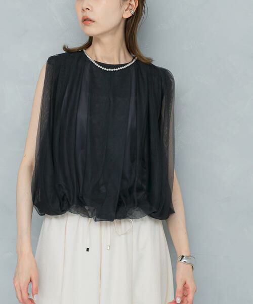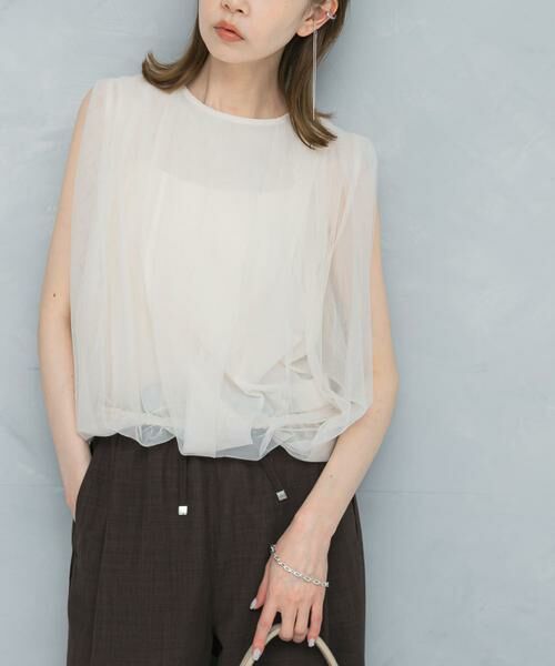 繊細なチュール素材が上品な華やかさを演出するノースリーブプルオーバー。タックデザインを施したことで立体感が生まれ、ふんわりと女性らしい印象に仕上げました。程よい透け感が、軽やかでエアリーな雰囲気をプラスします。ノースリーブながらも、さりげなく肩にかかるチュールが二の腕周りをカバー◎一枚で上品に映えるので、デニムやワイドパンツでカジュアルなスタイルはもちろん、スカートを合わせた綺麗めスタイルもお勧めです。