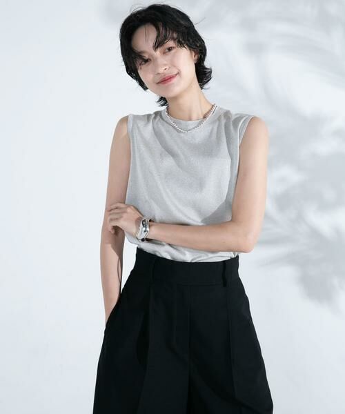 ほんのり光沢感のあるブライトヤーン素材が、華やかな印象を演出するノースリーブニット。肌離れの良いドライタッチな質感で、さらっと快適な着心地です。一枚でヘルシーな着こなしはもちろん、シアーシャツやジャケットのインナーとしても活躍。コンパクトなサイズ感で、フレアスカートやボリュームパンツなどともバランスが取りやすく、きちんと感と着映えを両立できる一着です。