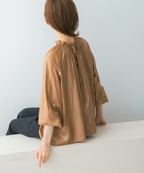 チンツ加工を施したグロッシーな艶感が、まるでレザーのような存在感を放つデザインブラウス。ギャザーが程よい立体感を生み、さらっと一枚で着映える主役トップスです。前後2WAY仕様で、気分に合わせて雰囲気を変えられるのも魅力的。リボンを前にすればさりげなく甘さをプラスできます。袖口にはゴムを施し、気温の高い時期からでも着用しやすいデザインに仕上げました。上質な艶感で、秋のムードを先取りできるアイテムです。