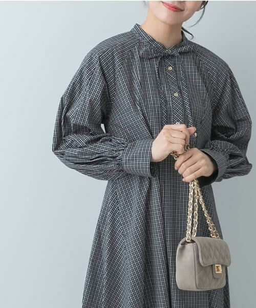 洗練されたチェック柄が印象的なワンピースは、一枚で着こなしが完成する便利なアイテム◎さらりとした肌触りの生地で、これからの季節に心地よく着用いただけます。首元はすっきりとしたバンドカラーで、上品な印象に。フロントのボタンと、胸元の控えめな切り替えがアクセントになっており、ゆったりとした身幅ながら、裾に向かって緩やかに広がるAラインシルエットが、体型を拾いにくく、リラックス感のある着心地と美しいラインを両立します。一枚でさらっと着るのはもちろん、肌寒い日にはカーディガンやジャケットを羽織るのもおすすめ◎