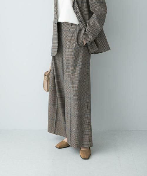 ブラウンチェックがクラシカルな印象のワイドスラックス。ハイウエストデザインとフロントに施されたタックが脚長効果を叶えます。ウエスト周りはすっきりとしており、トップスをインしても綺麗なシルエットに。程よく落ち感のある素材感で、すとんと落ちるワイドシルエットが美しく体型をカバー。オフィススタイルから綺麗めカジュアルまでON/OFF問わず活躍する一本です。同素材のチェックテーラードジャケット(品番:RAA7-27S704)とセットアップとしての着用もお勧めです。