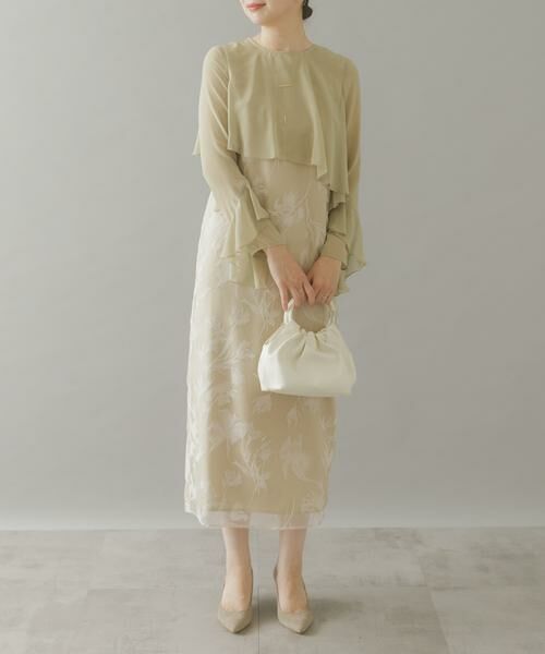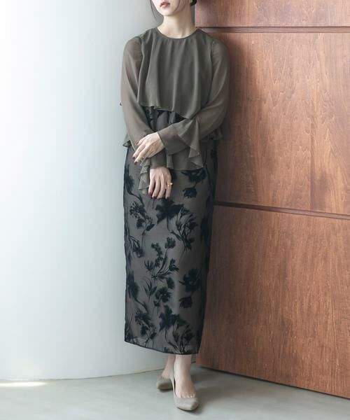 Iラインシルエットのワンピースに短めの丈のブラウスがドッキングした、デザインワンピース。ブラウスとワンピースは繋がっているため、一枚でレイヤードスタイルが叶います。袖口のフリルが手元をしなやかに見せ、華やかさをプラス。ブラウスにはフレア分量をたっぷりと入れ、ワンピースとシルエットにメリハリをつけることで、スタイルアップして見えるよう仕上げました。裾のスリットで足さばきも良く、フォーマル・オケージョンシーンや特別なお出かけの日まで、幅広く活躍してくれます。上品かつシックで、大人っぽい佇まいが叶う一着です。