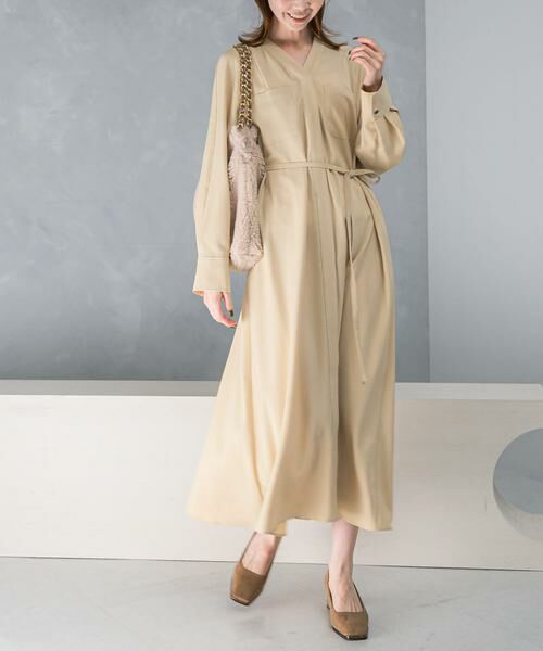 Vネックの抜け感が女性らしさを引き立てる、綺麗めワンピース。ウール調の上品な風合いで季節感を漂わせながらも、マシンウォッシャブル対応で気兼ねなく着られるのも嬉しいポイント。体型問わず着用していただきやすいよう、Vネックの開きやサイズ感にもこだわったデザインに仕上げました。共地のウエストリボンを結べば、メリハリのあるシルエットに◎きちんと感の中にさりげないカジュアルさもプラスした、幅広いシーンで重宝する一着です。
