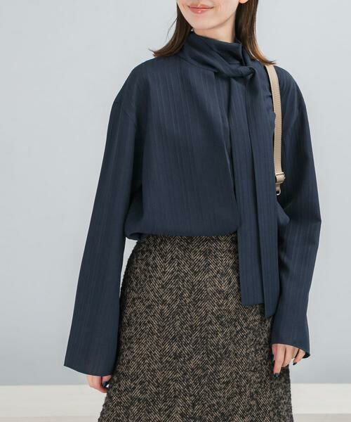ハイネックデザインのボウタイが、クラシックで印象的な一着。サイドポイントのデザインにより、スカーフのようにも片リボンのようにも見えるボウタイを表現。スタイリング次第で印象の変化を楽しめるのも魅力です。初秋には一枚で着られるのはもちろん、寒い季節にはニットやコートのインナーとして重ね着を楽しんでいただけます。デイリーにもオフィスシーンにも活躍すること間違いなしのブラウスです。上品なWHITEと、シャドーストライプ地のNAVYの2色展開でご用意。