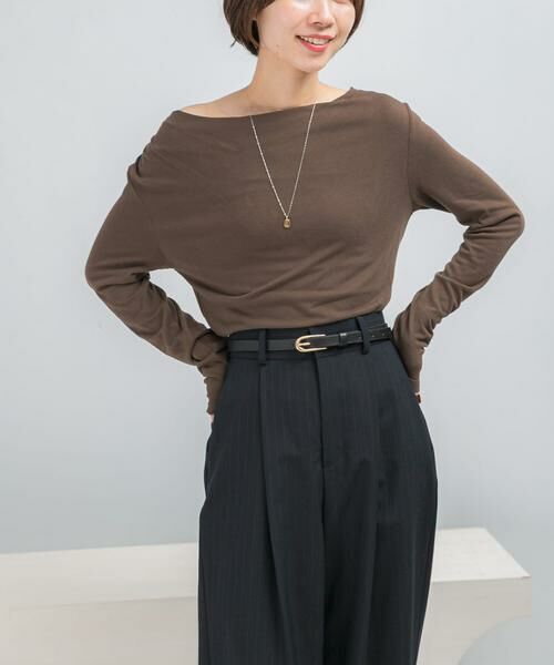 薄手ながら膨らみのある柔らかなタッチが特徴のカットソー。起毛素材で保温性・吸湿発熱機能を備えており、抗ピル性に優れた素材なのも魅力です。2WAYネックデザインによりオフショルダーやワンショルダーなど雰囲気を変えて楽しめます。ドレープネックはジャケットのインにも映え、どんなボトムにも合わせやすく、一枚で大人の綺麗めコーデが完成します。女性らしいシルエットで、パンツやストレートスカートとのスタイリングがおすすめ。着心地と機能性を兼ね備えた万能アイテムです。