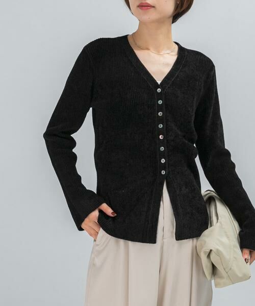 トレンド感のあるモール糸を使用した、タイトシルエットのカーディガン。上品な艶感と、ニット特有のチクチク感がない柔らかな肌触りが魅力です。もちっとした質感で着心地も抜群。リブ編みが縦のラインを強調し、ウエスト部分にボタンを集めることで、デザイン性とスタイルアップ効果を両立しました。深めのVネックがデコルテを美しく見せ、女性らしい印象に。羽織りとしてはもちろん、一枚でも着映える万能なアイテムです。