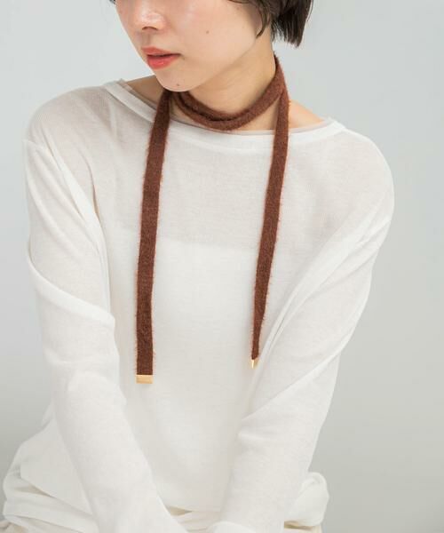 ふわふわした平紐が印象的なチョーカーは幅広なので首にすっと巻くだけで存在感抜群。前で結んだり、一周して前に垂らしたり、ぐるりと巻いて後ろで留めたり。細マフラーやストール感覚で首周りのファッションポイントとしていつものコーデにプラスするだけで大人こなれ感がぐっと高まります。チョーカー先端に「CHIGNON」刻印入り。