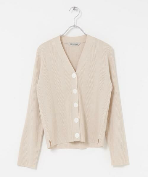 存在感のある大きい釦が印象的なリブニットカーディガン。