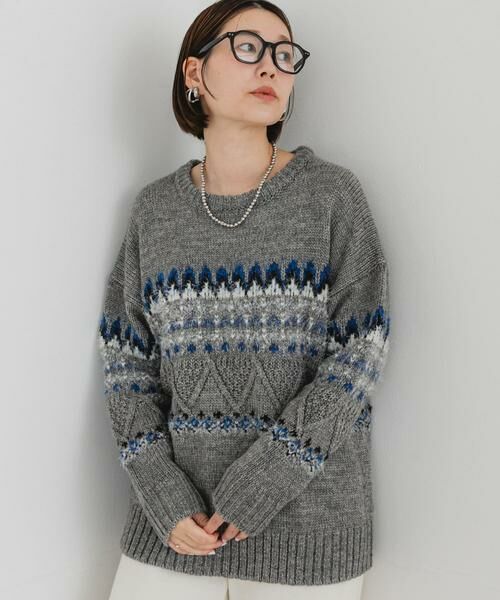 胸元から下にあしらわれたノルディック柄とケーブル編みを組み合わせた立体的なデザインが特徴のニット。落ち着いたベースカラーに鮮やかな配色が効いており、大人の遊び心を演出してくれます。ゆったりとしたリラックスシルエットでありながら長めの袖と裾のリブが全体をすっきりと引き締めてくれ、詰まりすぎていない首元が抜け感をプラス◎華やかなデザインは、シンプルなボトムスと合わせるだけでこなれた印象に。寒色系ですっきりとした印象のGRAYと、カラーの配色がコーディネートのポイントになるNAVYの2色でのご用意です。