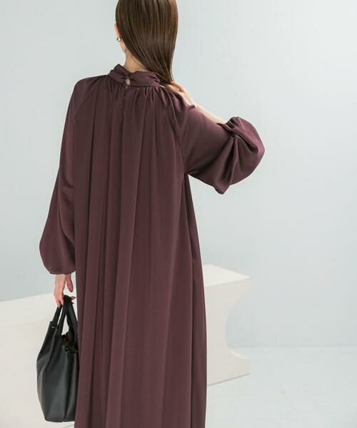 たっぷりとギャザーを寄せたサテン地が、動くたびに美しく揺れるハイネックドレス。やわらかなピーチタッチの素材が秋冬らしい季節感を添え、上品なツヤ感を演出します。襟もとや袖口にふんわりとギャザーを施したデザインで、顔まわりを華やかに、手首をさりげなく華奢に見せてくれる一枚。共布のウエストリボンでシルエットにメリハリをつければ、よりフェミニンな印象に。さっと一枚で着映えし、普段使いからお出かけまで幅広く活躍するドレスです。