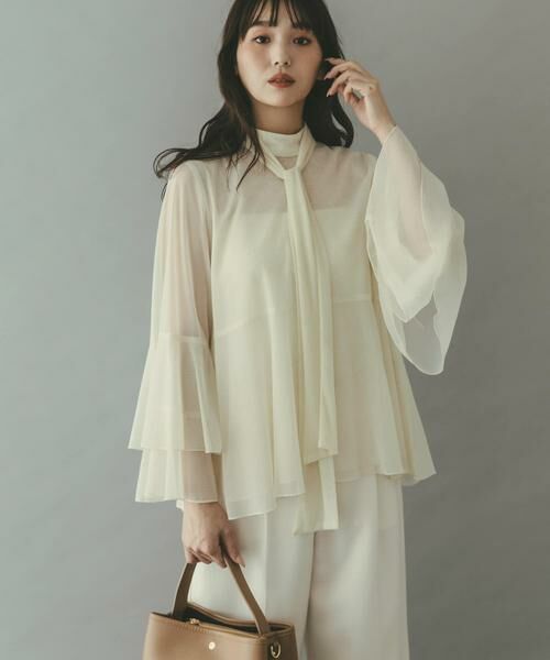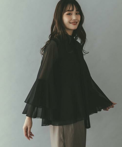 光を受けてきらめくラメストライプが、スタイリングにさりげないアクセントを添えるシアーチュールブラウス。細かなメッシュ素材は伸縮性があり、軽やかで快適な着心地です。裏面にも表地を使用した二枚仕立てで透け感を控えめにしつつ、二段フレアの袖や大きめのボウタイが動きに合わせて優雅に揺れ、女性らしい雰囲気を引き立てます。ややゆとりのあるシルエットとフレアの裾がつくる自然な広がりも魅力。ボウタイリボンは取り外し可能で、アレンジ次第で印象を変えられるのも嬉しいポイント。冬のパーティーシーンやお呼ばれはもちろん、普段のコーディネートにも取り入れやすいアイテムです。デニムでカジュアルに、ドレスパンツでエレガントにと、幅広い着こなしを楽しめる一枚。