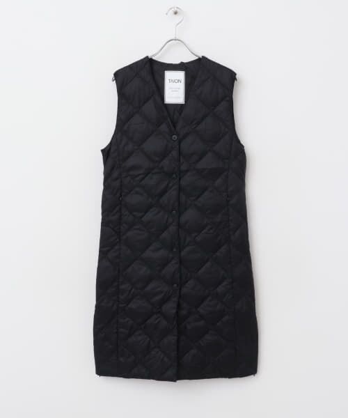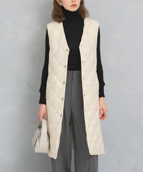 女性らしさを演出する、ロングダウンベスト。脇ファスナーを開閉することで、スリットが入り幅広いレイヤースタイルが楽しめます。軽さや吸い付くような肌触りを追及し、斜めキルトを採用することで、シックでクラシカルなイメージに仕上げています。