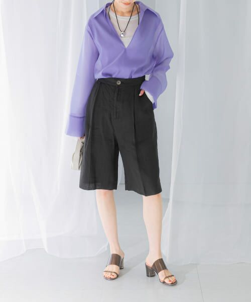 ラミー100%を使用した、トレンド感のあるハーフ丈パンツが登場。繊細で光沢感のあるラミー素材を採用し、適度なハリとツヤっぽさがハンサムな印象に仕上げてくれます。裏地付きのため透ける心配もなく、リラクシーに着用可能。膝が隠れる丈感とスラックスの印象を残した大人のハーフパンツは、華奢なサンダルと合わせて上品に仕上げるのが◎同素材のラミージャケット(品番:RAA5-27S501)との、セットアップコーデもお勧めです。