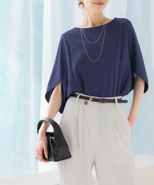 ラフに着こなせる肩馴染みの良いドルマンプルオーバーが、汗染み防止×接触冷感の機能を加え今季も登場。すっきり見えを叶える、ボートネック仕様で仕立てました。肘まで隠れる、女性らしい5分袖丈も魅力ポイント◎ソフトな風合い×伸縮性も兼ね備え、これからの時期に嬉しいリラクシーな着心地です。腰回りをカバーする後ろ下がりデザインのため、幅広いボトムと好相性の一着に。