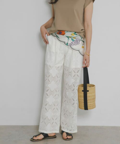 夏のワンツーコーディネートをランクアップしてくれる、上品なレースパンツが登場。ウエスト部分にこだわり、ゴム仕様でリラクシーな履き心地ながらも、タックとポケットが気になる腰回りをカバー。シンプルなTシャツとの合わせはもちろん、ワンピースにレイヤードして裾から少し見せるのもお勧めです◎繊細なレースは透けすぎず、程よい抜け感を演出してくれる"大人のためのレースパンツ"に。