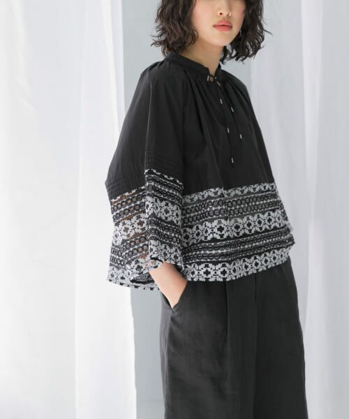 細かなディテールが他にはないコットンブラウス。肌触りの良いシャツ生地にクロシェ編みレースを施したデザインです。フロントのコードには手作業でシルバーの糸が巻き付けてあり、繊細なハンドワークとこだわりも魅力的。バックはボタン留めのオープン仕様で、大人な肌見せと涼しさが嬉しいポイントです。