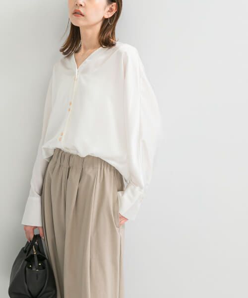 上品な光沢感が魅力のサテンブラウス。Vネックが顔回りをすっきりとした印象に仕上げます。フロントの釦がさりげないアクセントになり、シンプルなデザインながらも華やかな印象を演出。肌にさらりと馴染む落ち感のある素材感で、一枚ではもちろん、ジャケットのインナーとしても◎ボトムを選ばないバランスの取れたシルエットは、通勤スタイルから綺麗めカジュアルまで幅広く活躍します。