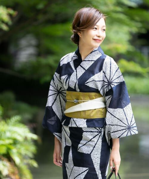 疋田(ひった)絞り柄で描いた麻の葉柄。繊細な絞り風友禅柄は「地しごき染め」技法でしか表現できない、伝統的技法で染め上げた京友禅染めの浴衣。インパクトのある柄に、落ち着いた紺地の麻の葉柄は、浴衣を既に持っている方にもぜひおすすめしたい柄のひとつ。大胆な麻柄が、数ある浴衣の中でも特にオシャレ度を高めてくれます。