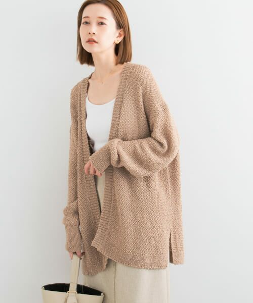 透かし編のシアー感がこなれた雰囲気を演出するカーディガン。変形のメッシュ編みで仕上げることで、糸の立体感を感じられるデザインです。腰回りをカバーするミドル丈は、デイリーの着回しに重宝。これからの暑くなる季節に向けて、冷房対策や日焼け対策にも活躍すること間違いなしの一着です。スタイリングに馴染む、camel・grayの2色展開でご用意。
