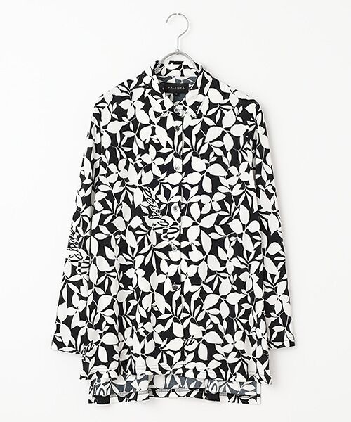■デザイン個性が光るリーフプリントブラウス☆上品に旬のスタイリングを作れるアイテム。ラフなシルエットながらも上質な素材で優しい印象に。カットソーの上に羽織ったり、釦を閉じてブラウスとして着たり、取り入れるだけでこなれ感を演出します。また爽やかなリーフ柄をモノトーンで表現。1枚で着るのはもちろん、ベストやジャンスカとのレイヤードスタイルでも普段のスタイリングをクラスアップしてくれます。隠れロゴの遊び心あるプリントにも注目です。