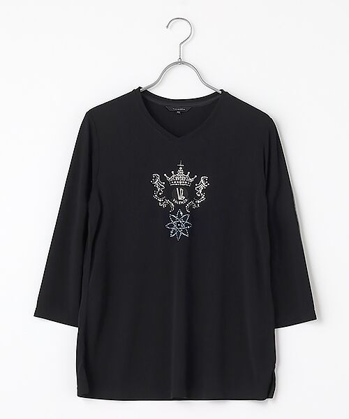 大人のこなれカジュアルに必須な優秀アイテム☆■デザイン高級感漂う上品なブラックにラインストーンが施されています。着まわし力・着心地がバツグンの優秀カットソー◎シーズン長く愛用できる7分袖で洗練された着こなしを楽しめます。■スタイリングほどよい開き具合できちんと感もある浅めVネックはジャケットのインナーとしてもぴったりです。1枚で着ても重ね着をしてもオシャレに見えます。■素材#肌触りのよいサラサラとした風合い#ひんやりした着心地と清涼感#高い吸水性と消臭効果#ドレープ性に優れしなやか