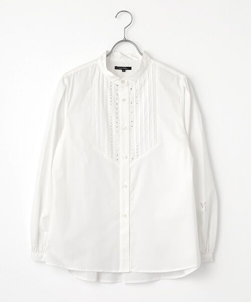 カジュアルにもスタイリッシュにも仕上がる万能アイテム☆■デザイン整列された繊細なタックやラインストーンが好感度UP↗ほどよい高さのスタンドネックは閉めて上品に着ても開けてラフに着ても、どちらもハマるデザインです。■スタイリング合わせるボトム次第できれいめからカジュアルまで幅広く活躍。ワイドなパンツを合わせればリラクシーな雰囲気が楽しめます。■素材美しい表面感のストレッチブロード。軽やかで肌ざわりがよく薄手ながらハリのある風合いです。(60sブロードストレッチ)#快適ストレッチ