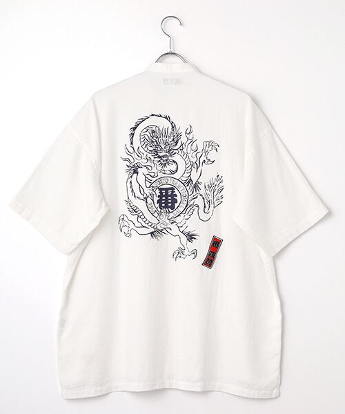 辰年にちなんでデザインから拘ったバンドカラーシャツが登場。 綿の柔らかさと麻の通気性とシャリ感を持ち合わせた綿麻生地。 裾にはVANロゴの刺繍、バックプリントには和風の龍を手書きでダイナミックにデザインし千社札をモチーフにした刺繍を施しています。 躍動感のある龍は大人の男性が粋にきていただける一着です。