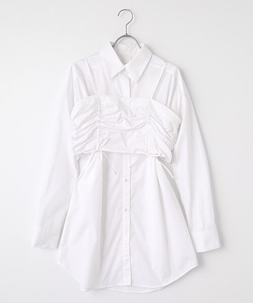 取り外し可能な同素材のビスチェセット。1枚でシンプルなシャツとしても楽しめる多機能なアイテムです。コットンとポリエステルの混合素材を使用しており、シワになりにくいヴィンテージ加工が施されています。ゆったりとしたシルエットをビスチェでウエストマークすることで、スタイルアップを実現。カジュアルにもフォーマルにも対応可能なデザインで、コーディネートの幅が広がります。