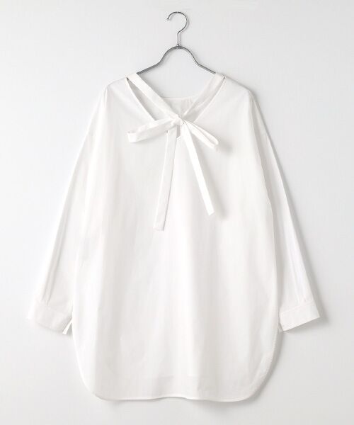 薄手のタイプライター素材で、身頃の2段のリボンを結んでギュッとシワを寄せていただくデザインです。衿のリボンはそのままボウブラウスとして垂らして、前後着用可の2WAY仕様。チュニック丈で、オフボディサイズ、深いシャツヘムのスリットがボトムを合わせやすいデザインです。