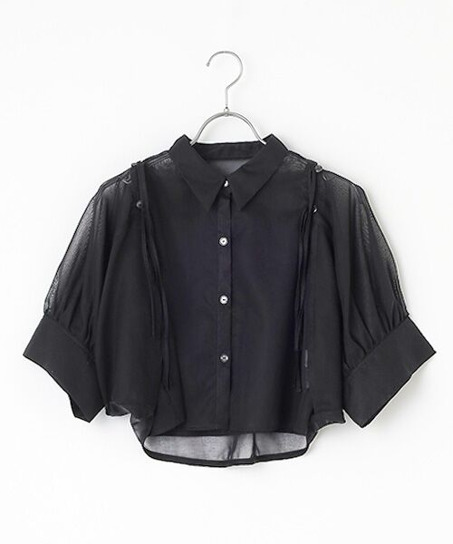 ボレロドッキング型のシャツで、程よい透け感が魅力的な一着。羽織としても使えるデザインで、ドッキング部分には紐ディテールがアクセントに。クロップド丈が軽やかで、コーディネートにさりげない個性をプラスします。シンプルながらもデザイン性のあるアイテムで、さまざまなスタイルに合わせやすいです。