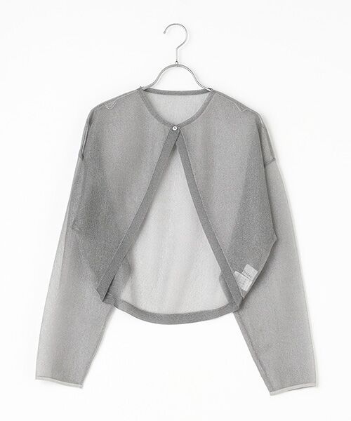 透明感のある無地ジャガードのニットボレロです。光沢があり、裾が身体にフィットして溜まるシルエットが可愛らしく、軽くて着ていないかのような羽織アイテムです。