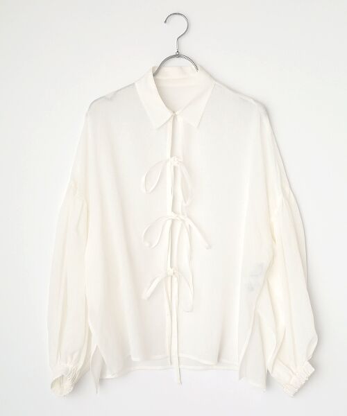 ナチュラルな表面感のシアーガーゼ素材のシャツブラウスです。前明きをリボンにした羽織りのデザイン。シアーヘムキャミドレスの裾と同素材なので、SET UPもお勧めです。