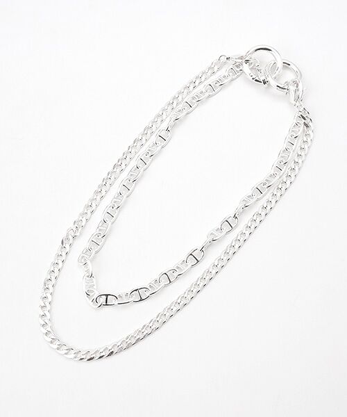 ボトムのベルトループ飾りにしたり、ジャケットなどのトップスの釦ホール等に付けたり、ストラップとして使ったりと、アイデア次第でいろいろ使えるアクセサリーです。垂らしたときにニュアンスの出るチェーンの巾と長さの設定、白金とガンメタリックのカラーにも拘りました。
