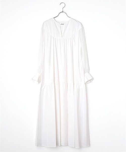 良質な長綿オーガニック原料を使用した、やさしい風合いのタイプライター素材です。キーネックは抜け感があり、二段切り替えのフレアーティアードが身体を覆います。袖は薄いシフォンで透け感を出しました。凝っていますがシャツ素材なので、ジレや肩掛けなどアレンジしやすいデザインです。透けにくいので一枚で着ていただけます。