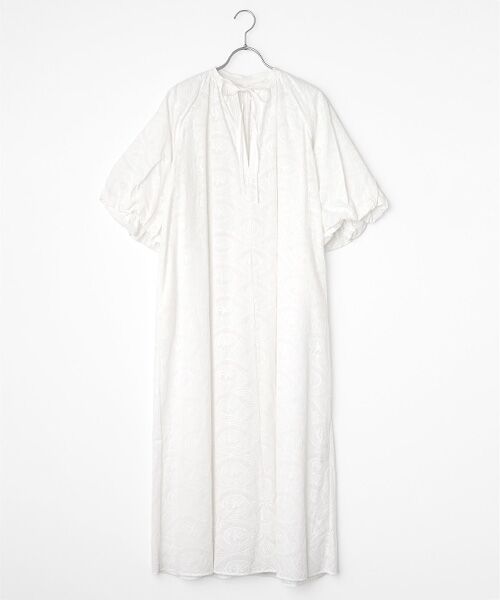 程よい透け感のコットンローンエンブロイダリーレースのワンピースです。ゆったりとしたシルエットで、深い明きのフロントスリットはインナーとのレイヤードも楽しめて、長めのバルーンスリーブが二の腕をカバー、たっぷりとしたボリュームが手首を細見せします。甘めなので、あえてジャケットなどカッチリしたアイテムとの合わせも素敵です。