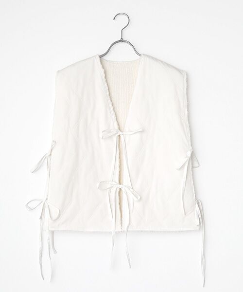ツイルのキルトとフワッとしたニットのリバーシブルデザイン。肩掛けして、お好きなところのリボンを結んだり、そのまま垂らして頂いても甘すぎずお勧めです。軽くて薄い中綿が入っているので暖かく、ワンピースやTシャツに合わせたりノースリーブにも可愛らしい、まだ暑い時期に秋を感じさせるシーズンアイテムです。