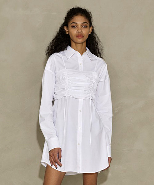 取り外し可能な同素材のビスチェとセットになったシャツ。1枚でシンプルなシャツとしても楽しめる多機能なアイテムです。コットンとポリエステルの混合素材を使用しており、シワになりにくいヴィンテージ加工が施されています。