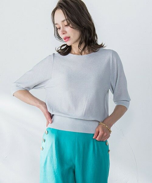 動くたびにさりげなく光るミニスパンコールを編み込んだ5分丈のプルオーバーニット。