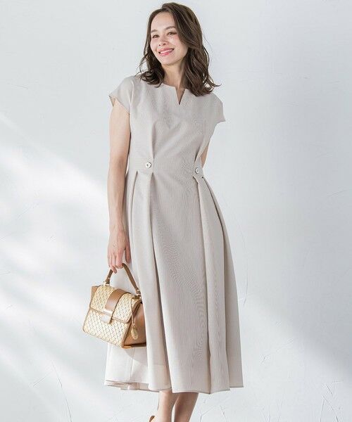 女性らしいフィットアンドフレアーのシルエットと、顔周りをすっきりと見せるキーネックで上品に仕上げています。