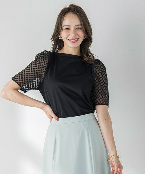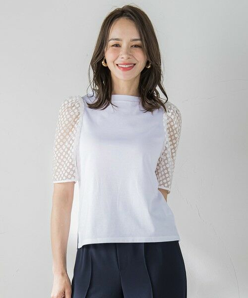 シアースリーブのデザインカットソー。袖にはシアー感がポイントのドット生地を使用しトレンドのムードを。身頃には上質なスーピマコットンのポンチ素材を使用しており、美しい光沢と肌触りが特徴です。程よい肉感なのでインナーの透けもなく、ボディラインも拾いにくい点も嬉しいポイント。衿はスタンドカラーでクラシカルに仕上げています。フレアスカートやワイドパンツなどのボリュームボトムと好相性です。