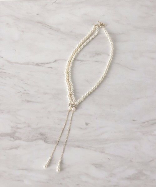 洗練された上品さを纏う、スライドパール調ネックレス。艶やかなフェイクパールを連ねた、2連風のエレガントネックレス。中央のスライダーで長さを調整できる仕様になっており、動くたびに揺れるチャームが視線を惹きつけます。きらりと輝くストーンのラインと組み合わせることで、程よい華やかさと上品さを演出。ブラウスやニットの首元に添えるだけで、きちんと感のあるスタイリングが完成。パーティーやセレモニーはもちろん、デイリーの格上げアイテムとしてもおすすめです。