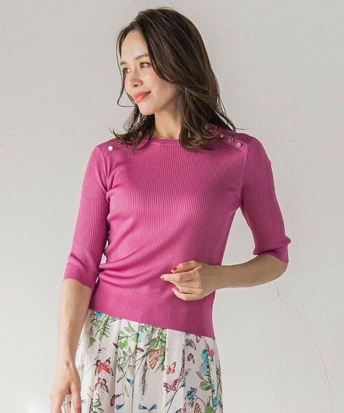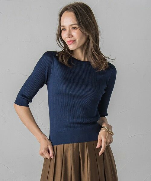 心地よい着用感のリブ組織で編みたて、肩のメタルボタンデザインがポイント。