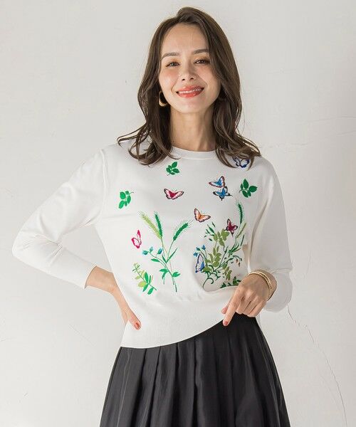 ボタニカルと蝶々をテーマにしたバタフライモチーフの刺繍がポイントのクルーネックニット。