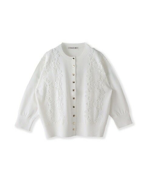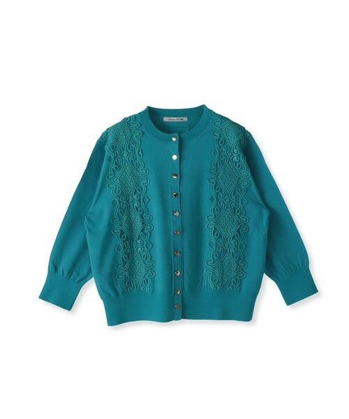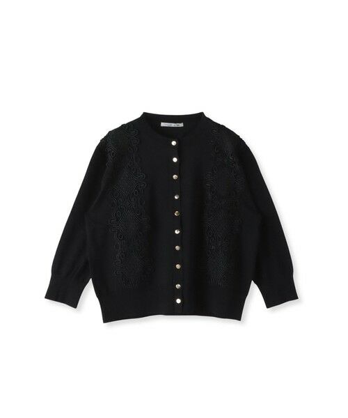 前身頃を繊細なレース刺繍で切り替えた、華やかカーディガン。