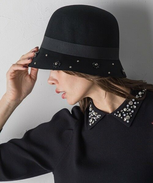 つば部分に散りばめられた小花とビジューが上品に輝き、シンプルな装いにアクセントをプラスします。