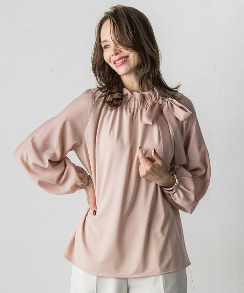 表情感のある素材の袖とサイドリボンデザインがポイントのブラウスライクカットソー。