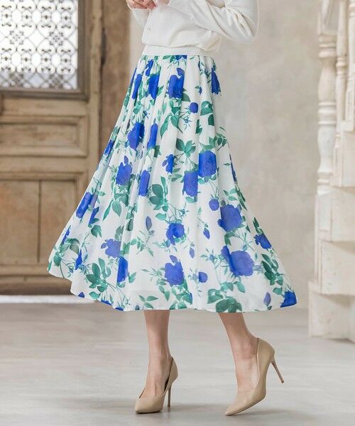 透明感のあるシアー素材に、繊細で優美なブルーのローズプリントをあしらったフレアスカート。