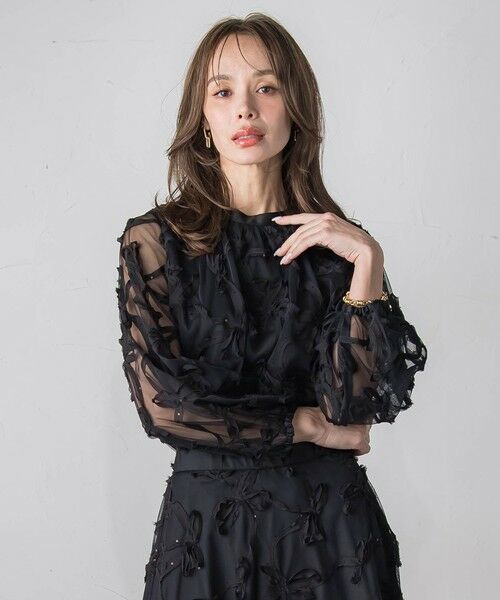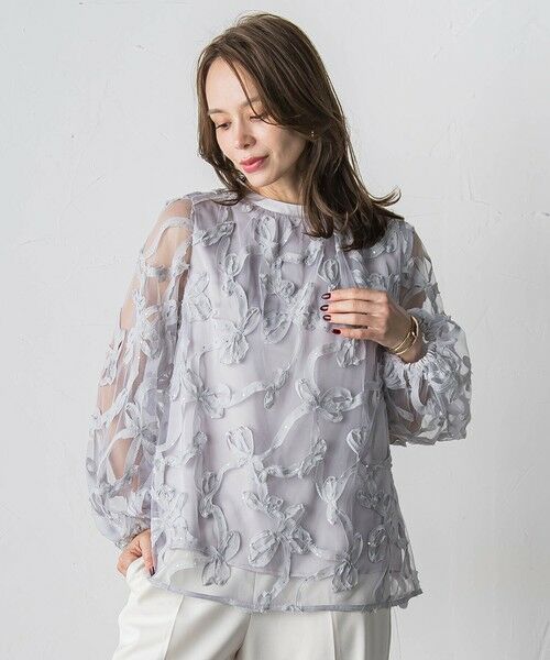 繊細な輝きと立体感を纏うテープ刺繍のシアーブラウス。